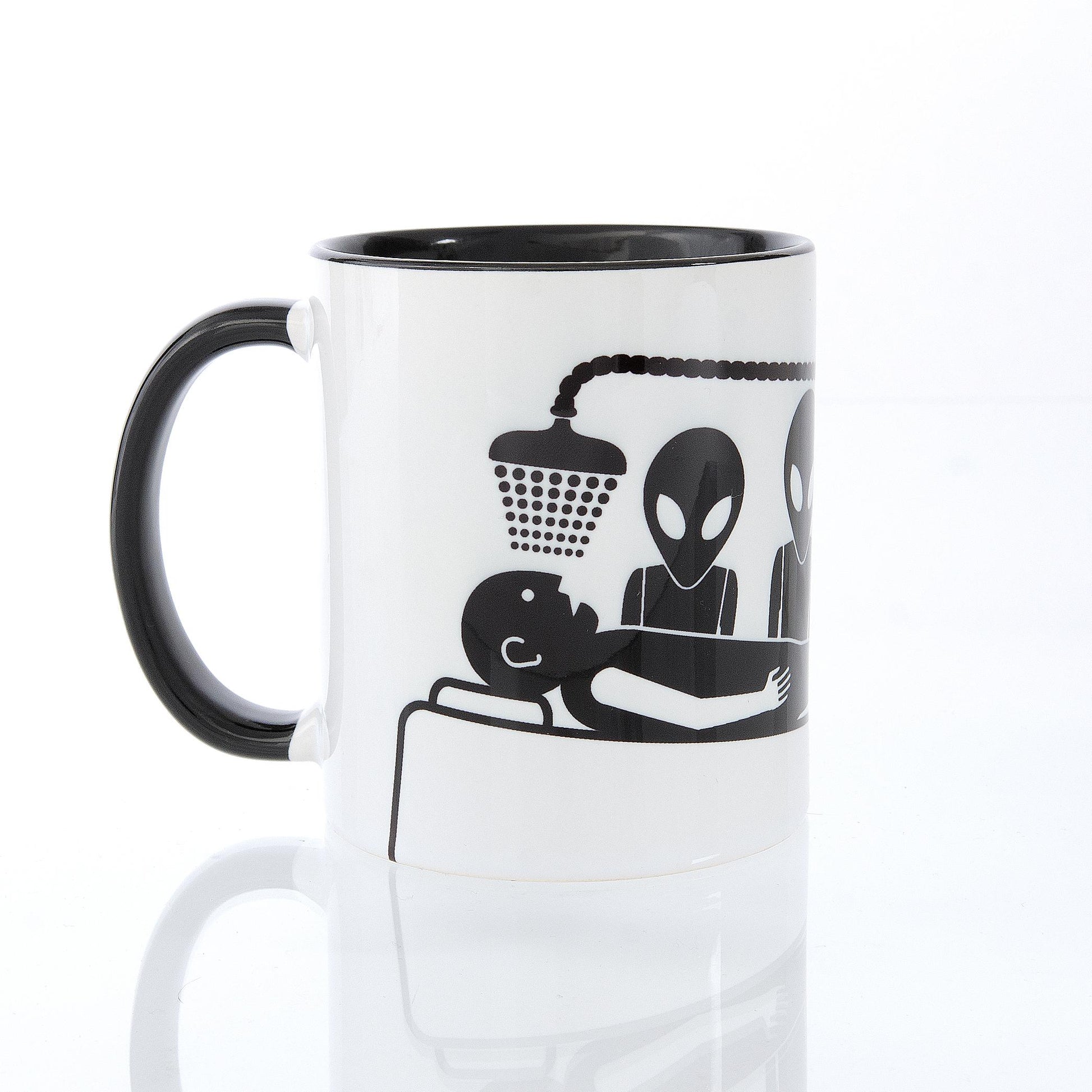 • Abduction graphic printed on a black mug, printed in Ohio.